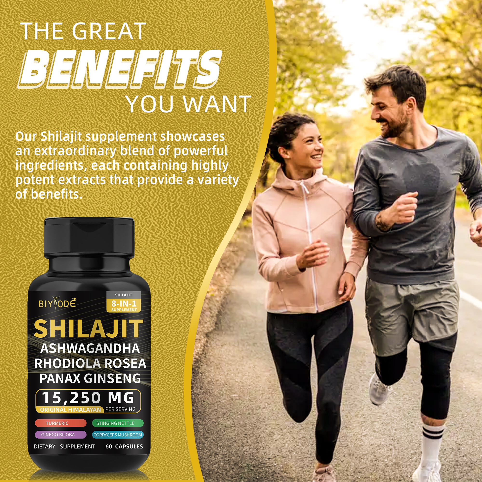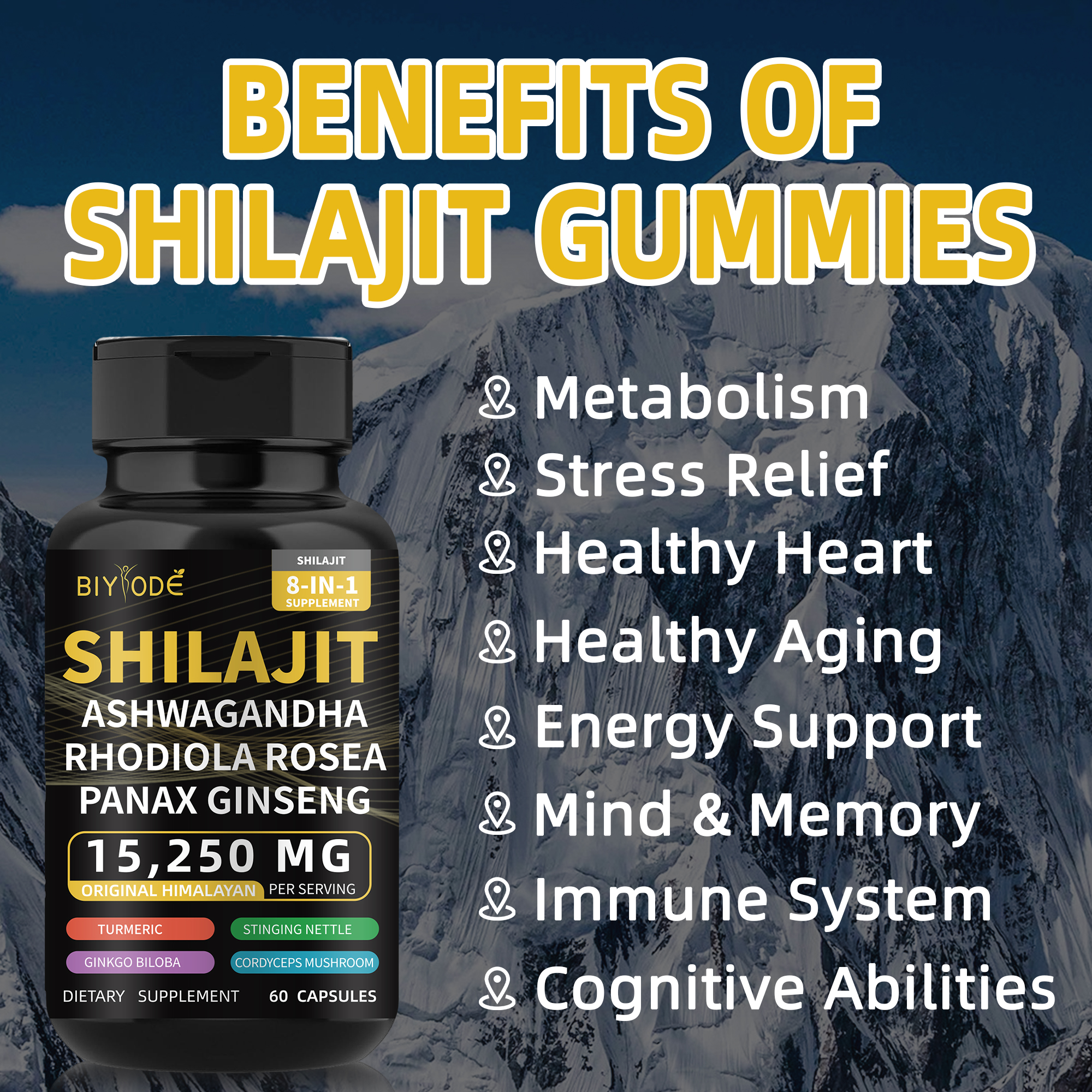 Biyode Formula Eraginkorra Stock Prest Bidalketa Azkarra Handizkako Puru Natural Himalaiako Shilajit Kapsulak Ashwagandha Ginseng-ekin Osasun-laguntza 8 bitamina 1ean Energia Osagarria