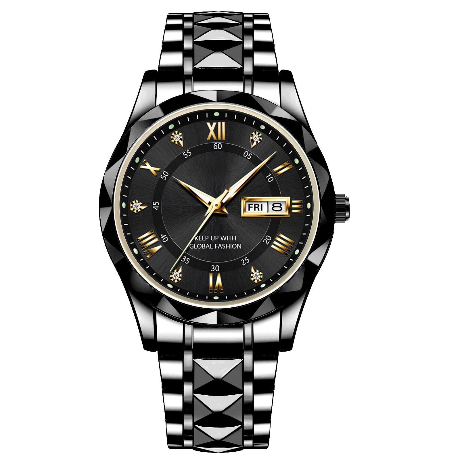 Eleva o teu estilo co noso deseño clásico de roupa informal de negocios. O elegante bisel dourado adornado con diamantes firmes complementa a esfera negra de gran esfera con índices dourados (1,6"/40 mm). Unha declaración de moda atemporal para o home moderno!