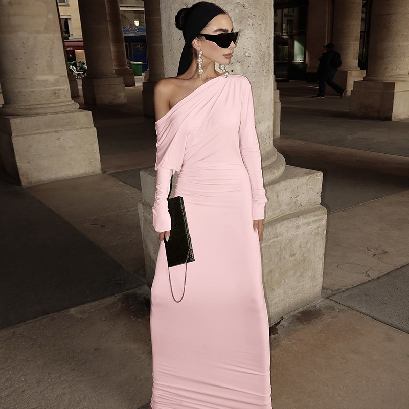 Vestido de manga longa con ombreiros descubertos e corte axustado para muller