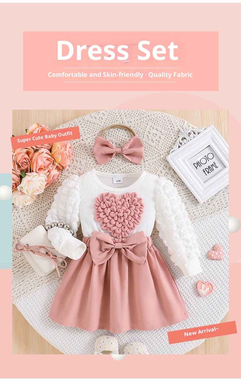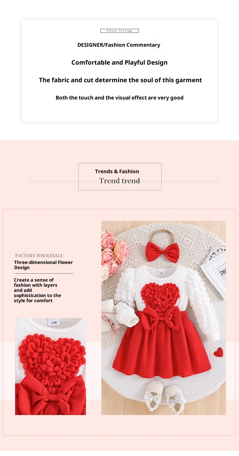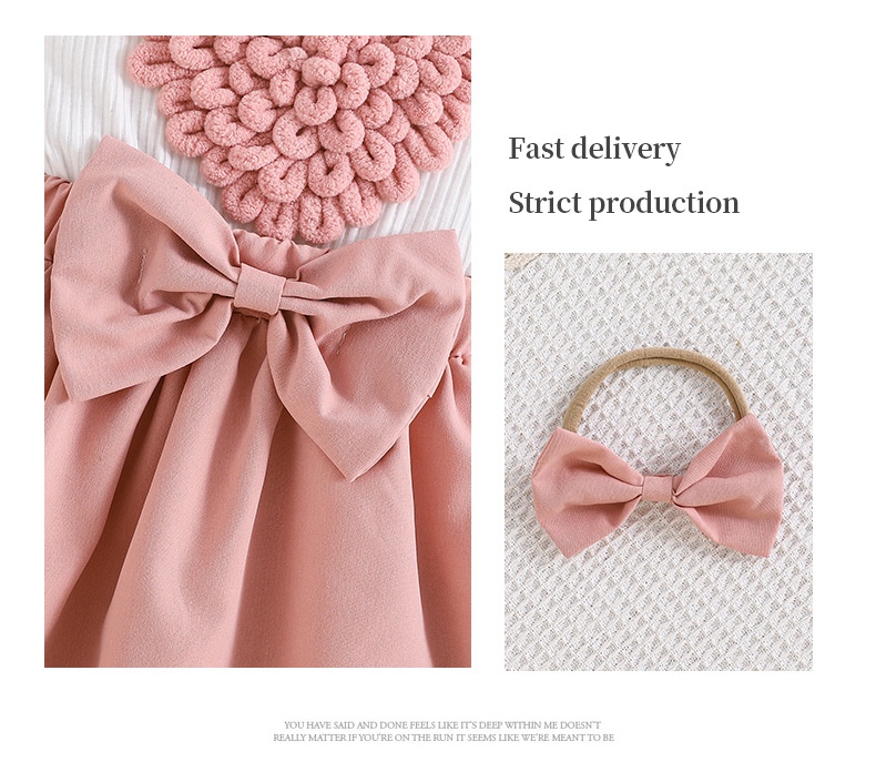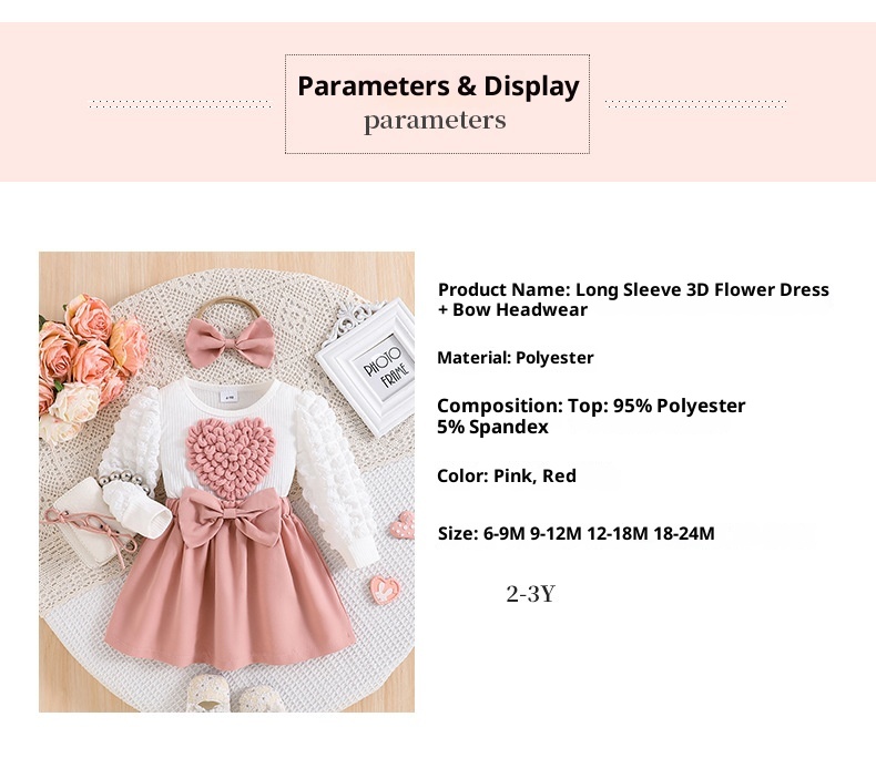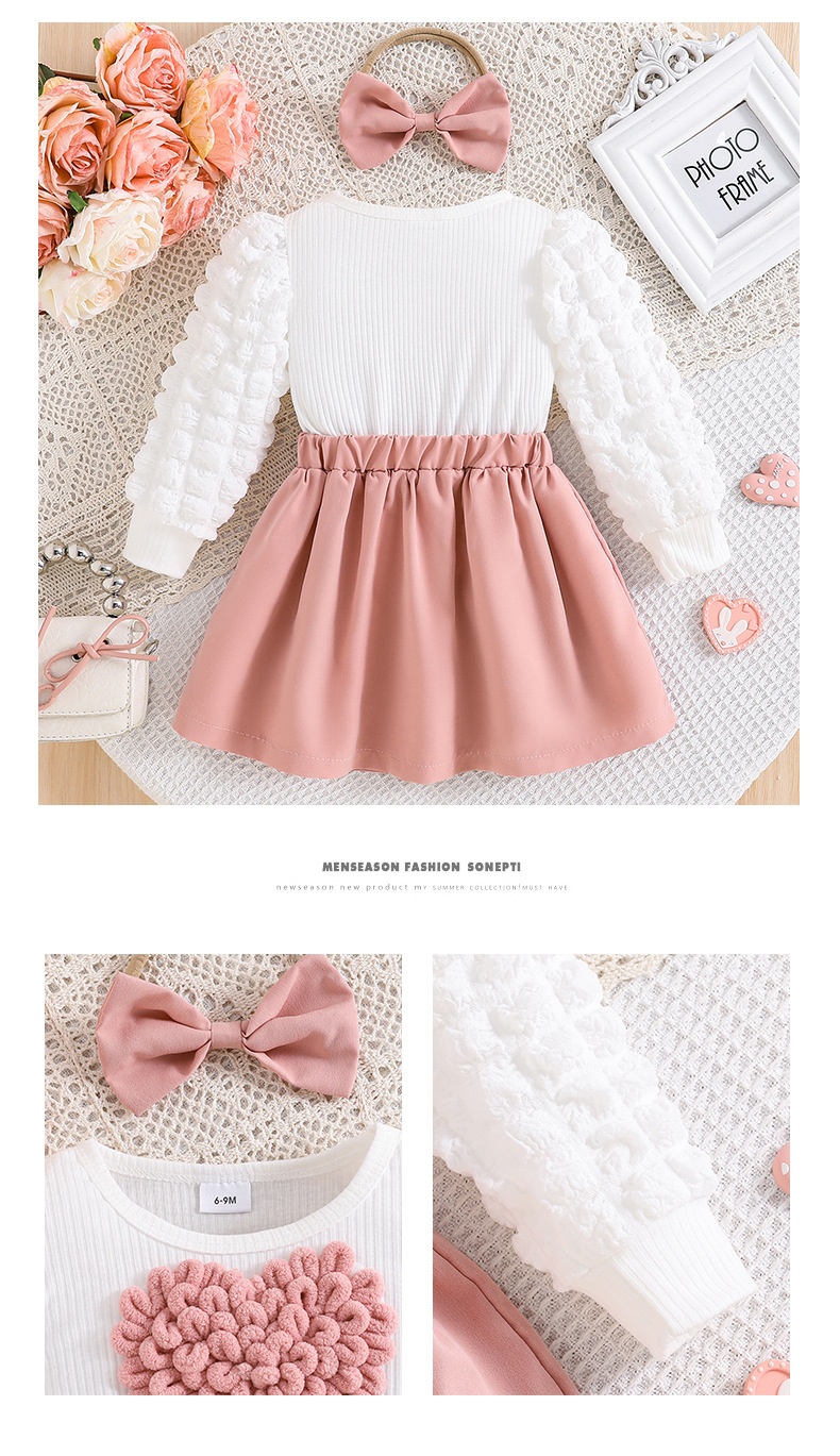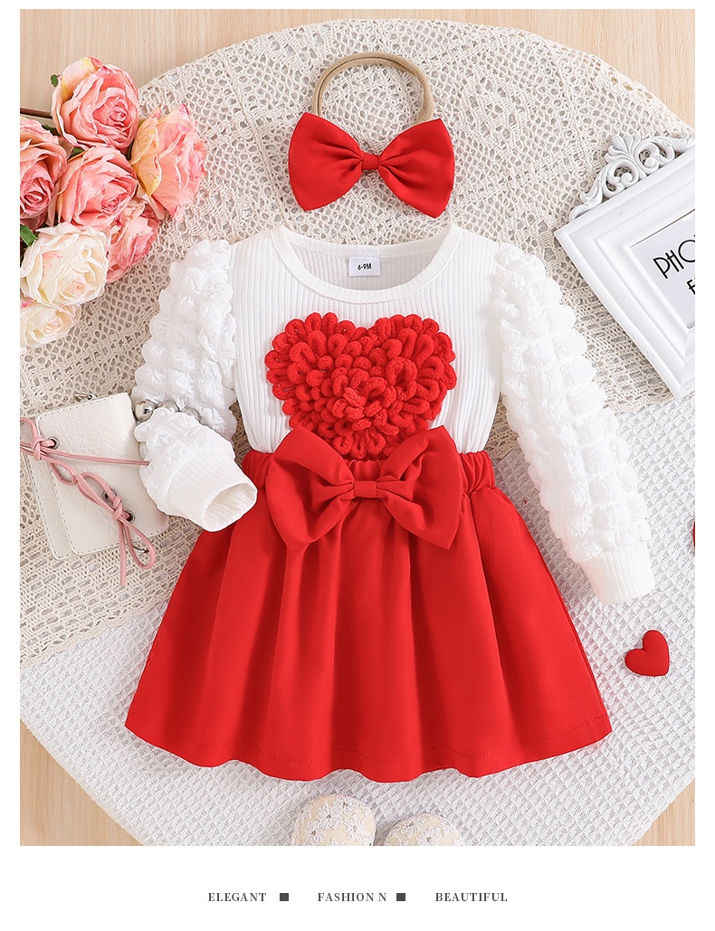 Abito corto con maniche a sbuffo, top rosa e fiocco rosso, fiori tridimensionali