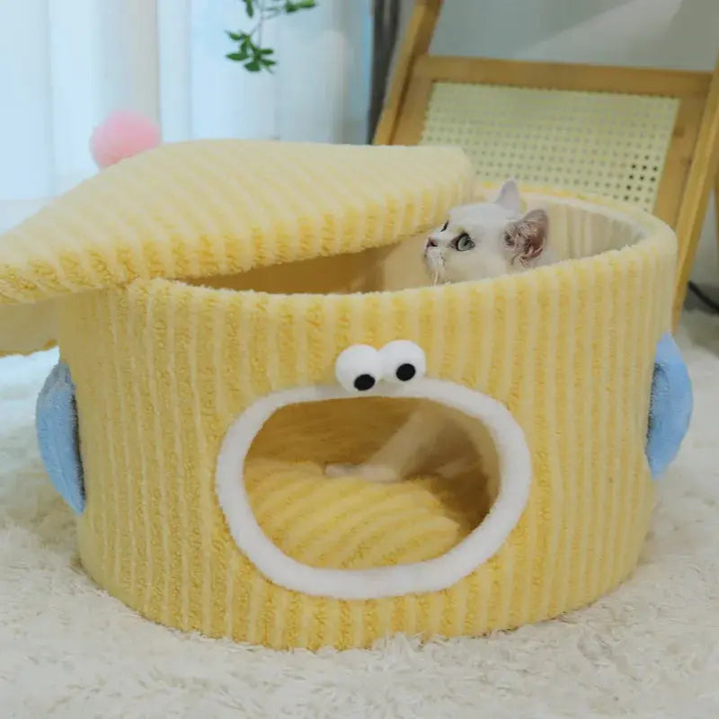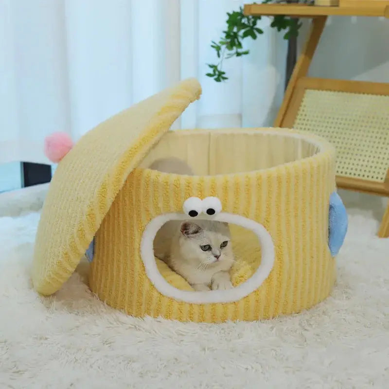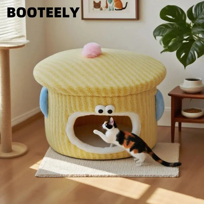 BOOTEELY Cute Cartoon Cat Bed Soft Corduroy Pet Cave With Adorable Face Design Warm Kitten Sleeping Nest