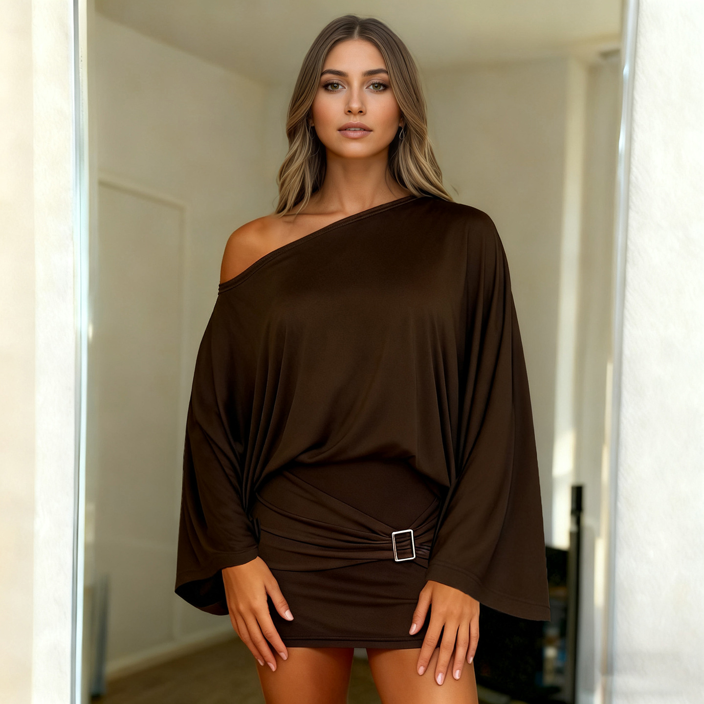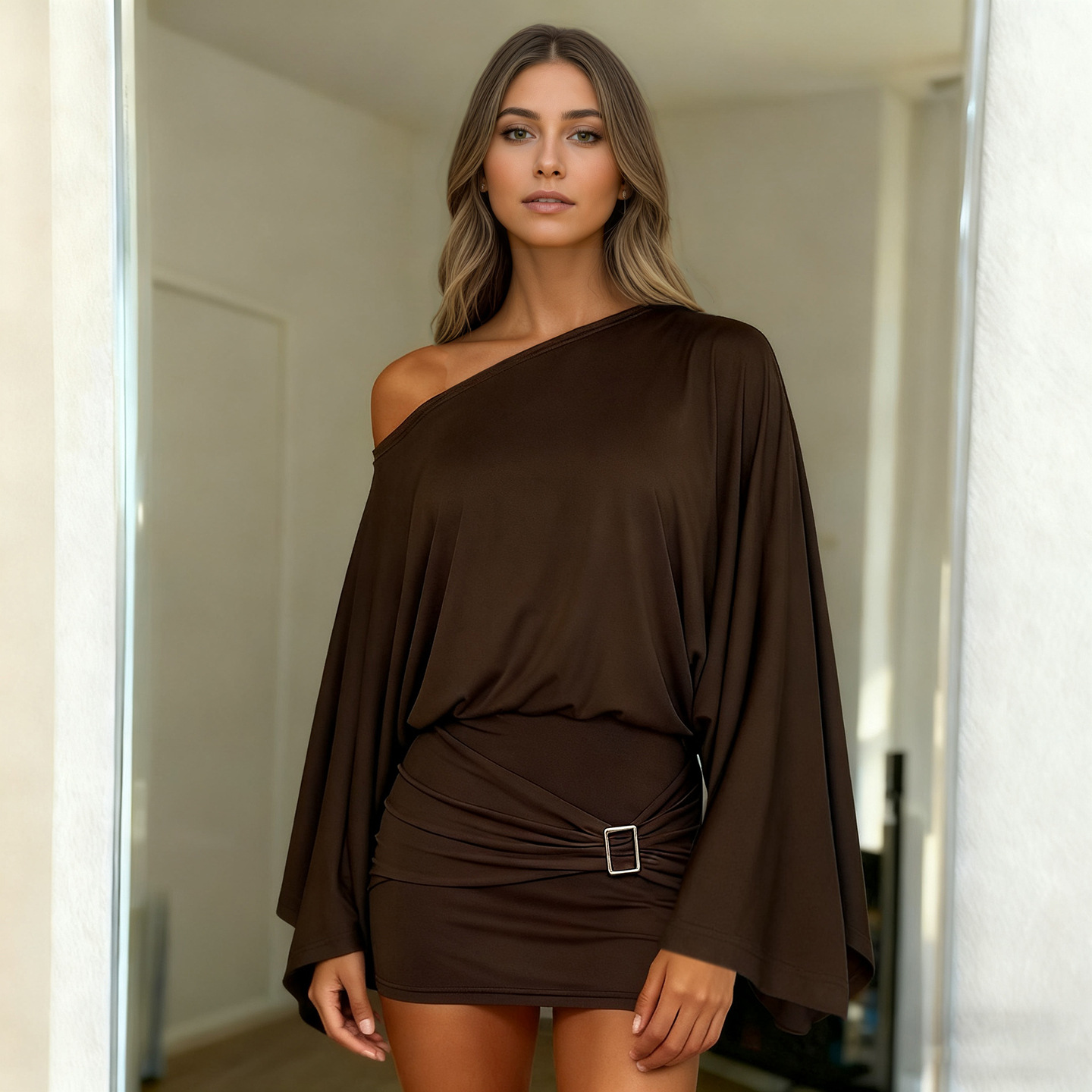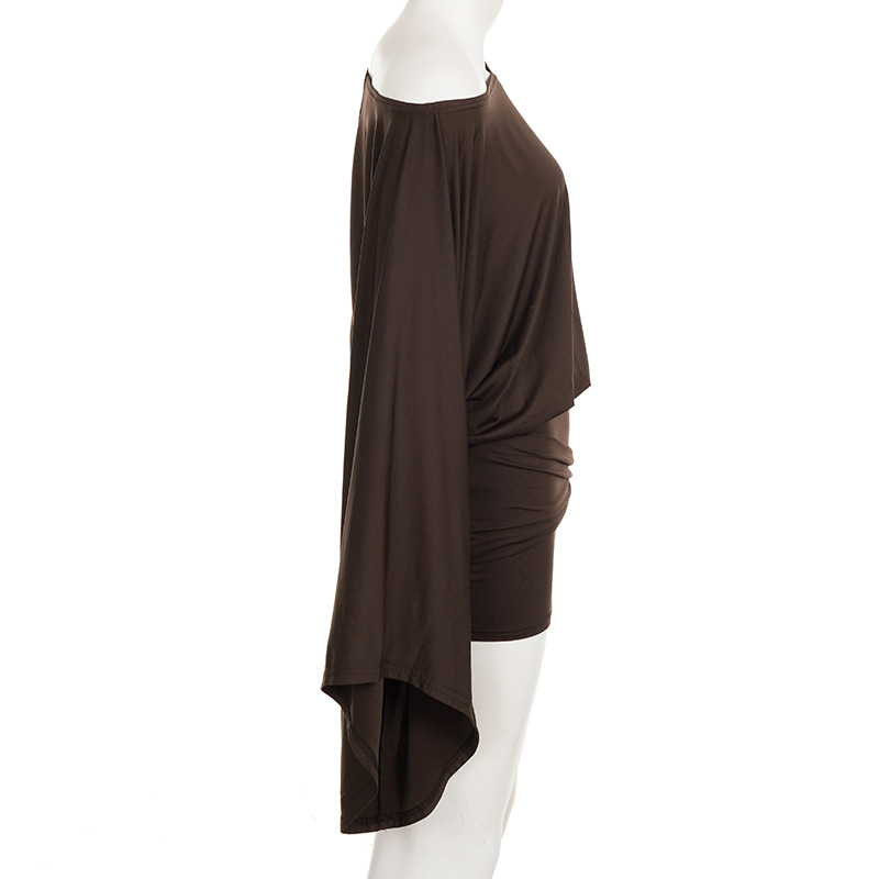 Classical European And American Style Slant Shoulder Loose Bell Sleeve Dress