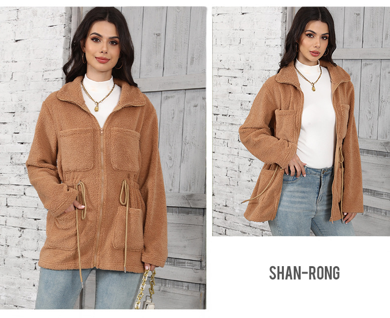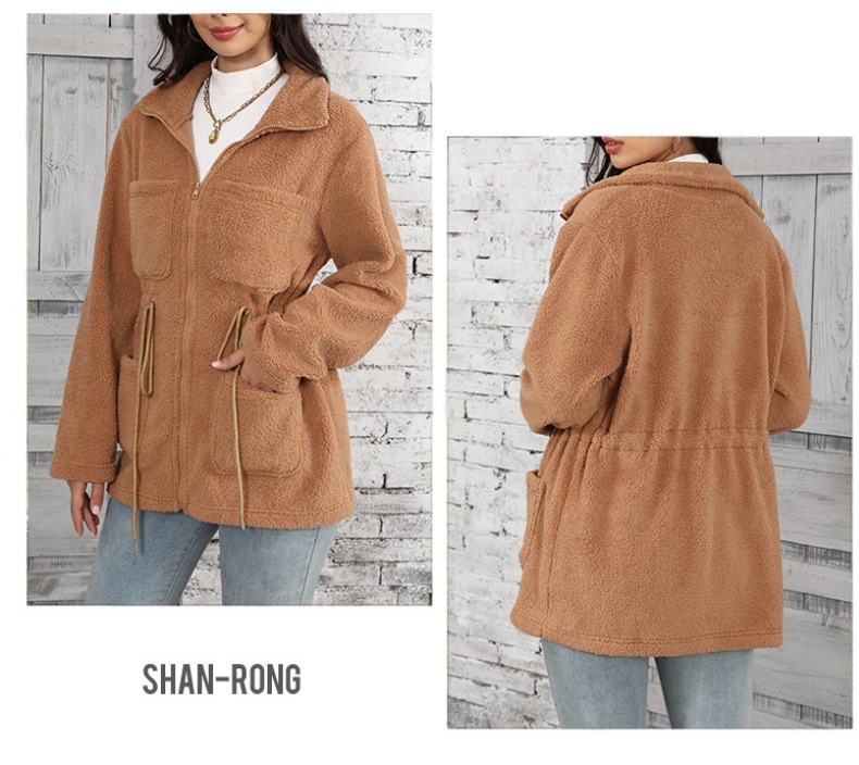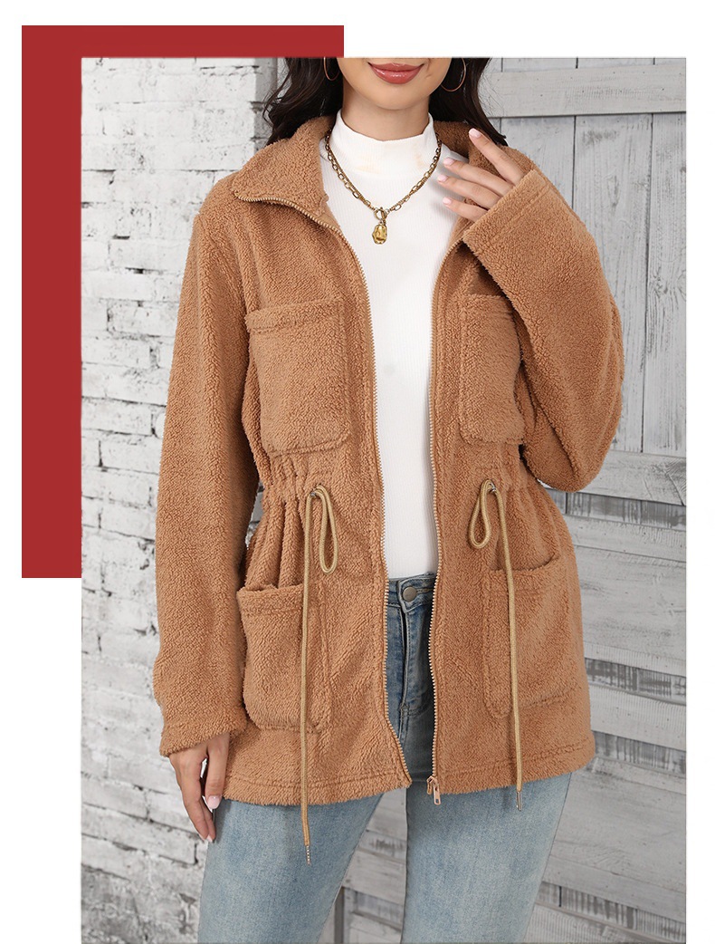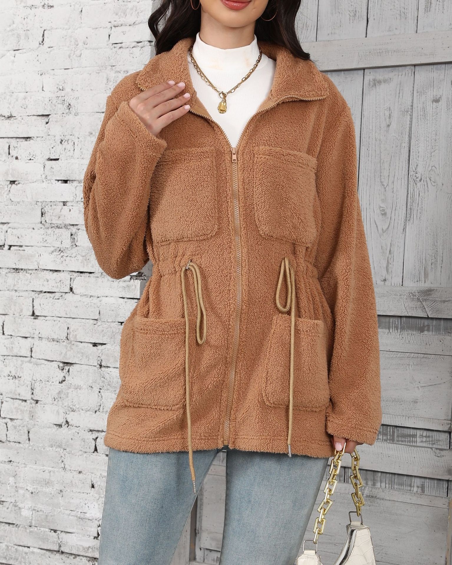 Loose Pockets Zipper And Lapel Long Sleeve Cardigan Plush Coat