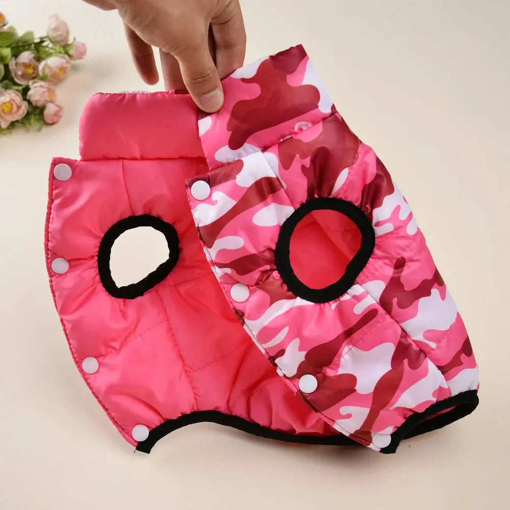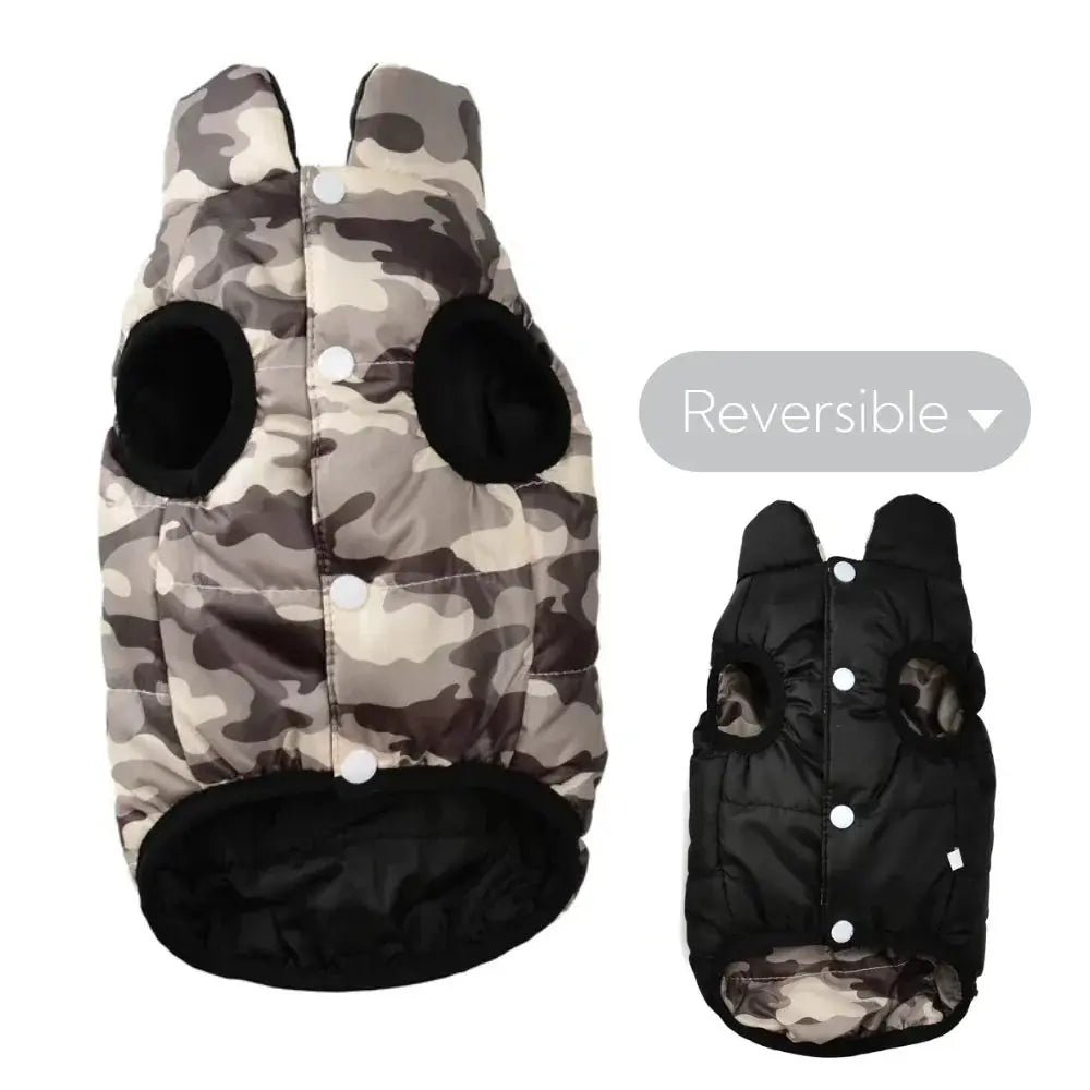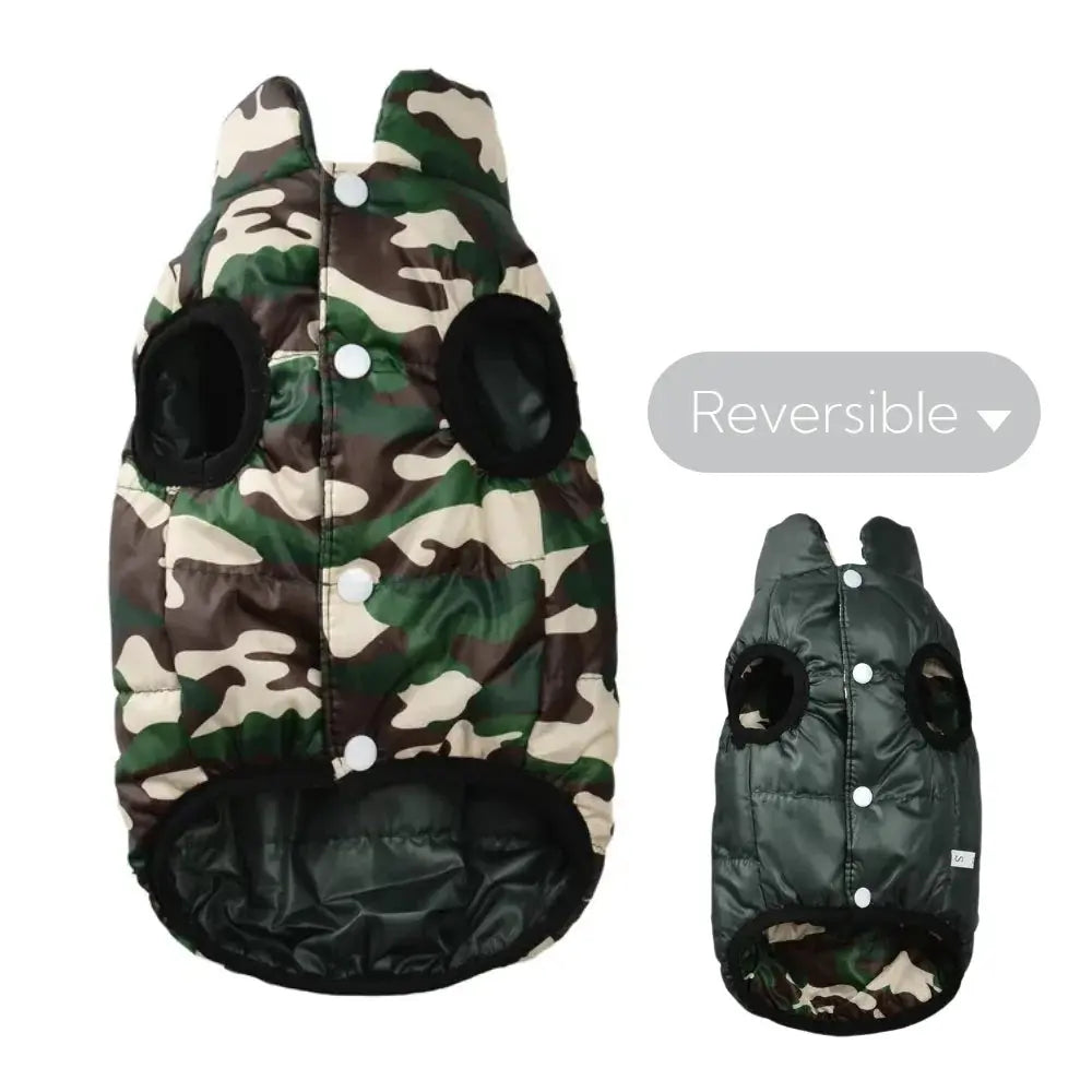 The reversible dog jacket is not just a fashionable addition to your dog's winter wardrobe; it also offers practicality with its two unique styles. With a warm camouflage print on one side and a solid color on the other, your furry friend will be ready for any occasion. The built-in leash hole makes it easy to attach a leash directly onto your dog's collar, ensuring convenience when you’re out and about. This design is perfect because it allows you to switch up your dog's look with ease, making walks more enjoyable.