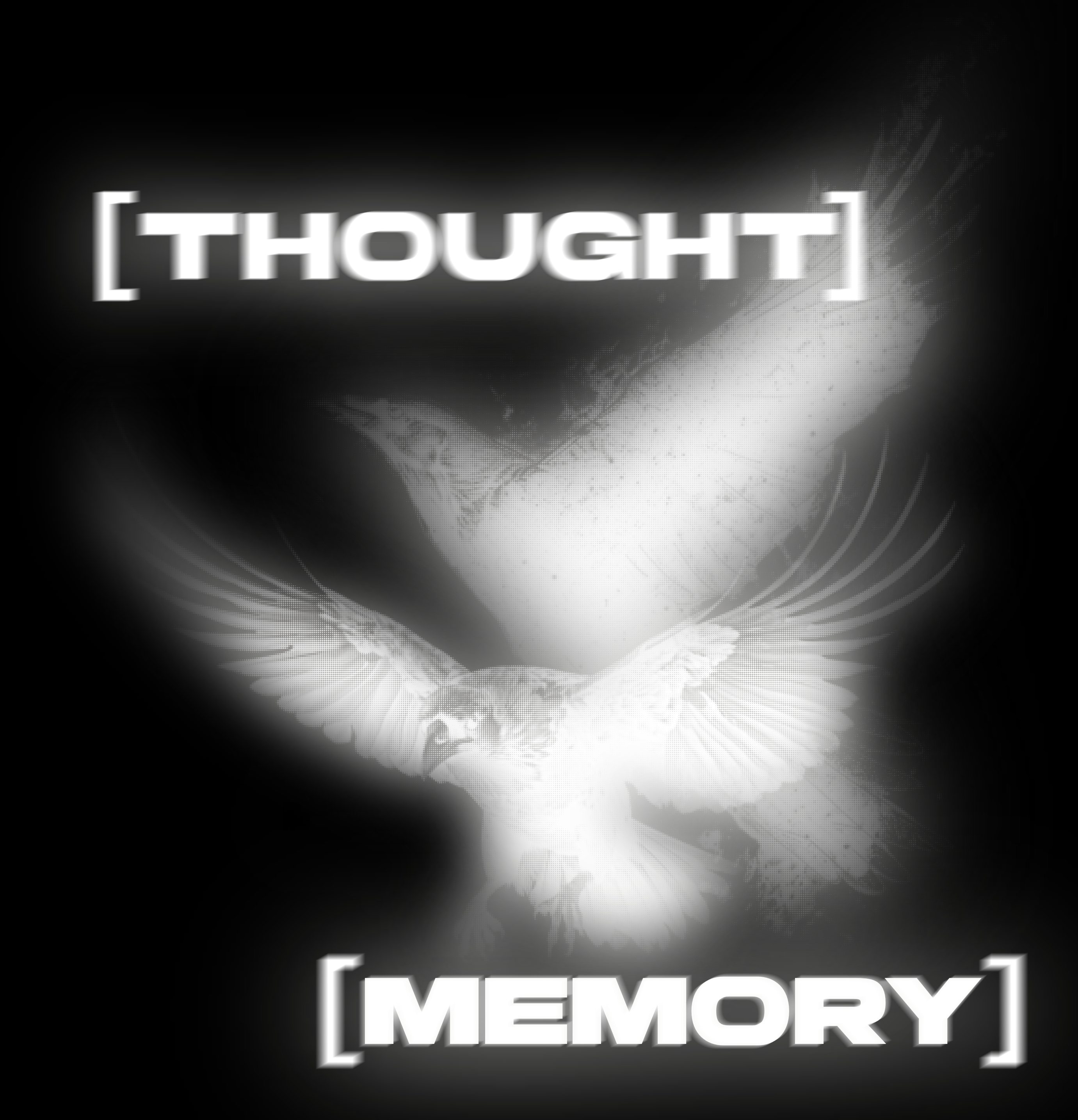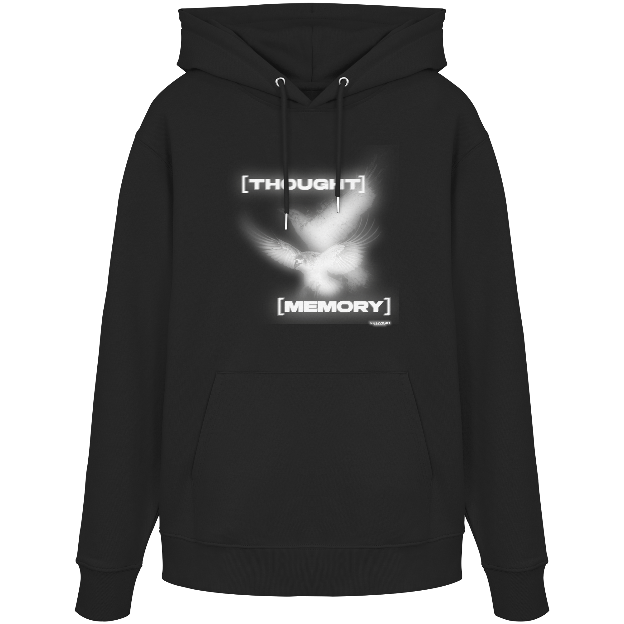 Der Frontprint verbindet [THOUGHT] und [MEMORY] – Bewusstsein im Moment und Bewahren der Vergangenheit. Zwei Raben als Sinnbilder für Odins Gefährten Huginn und Muninn tragen die Dualität von Gegenwart und Erinnerung in kraftvoller, moderner Form.