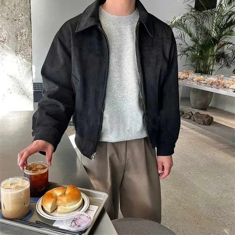 Threebooy Elegant Solid Brown Coat Men's Spring Autumn High-end Loose Lapel Plush Top Winter New Zipper Short Jacket Vintage Streetwear